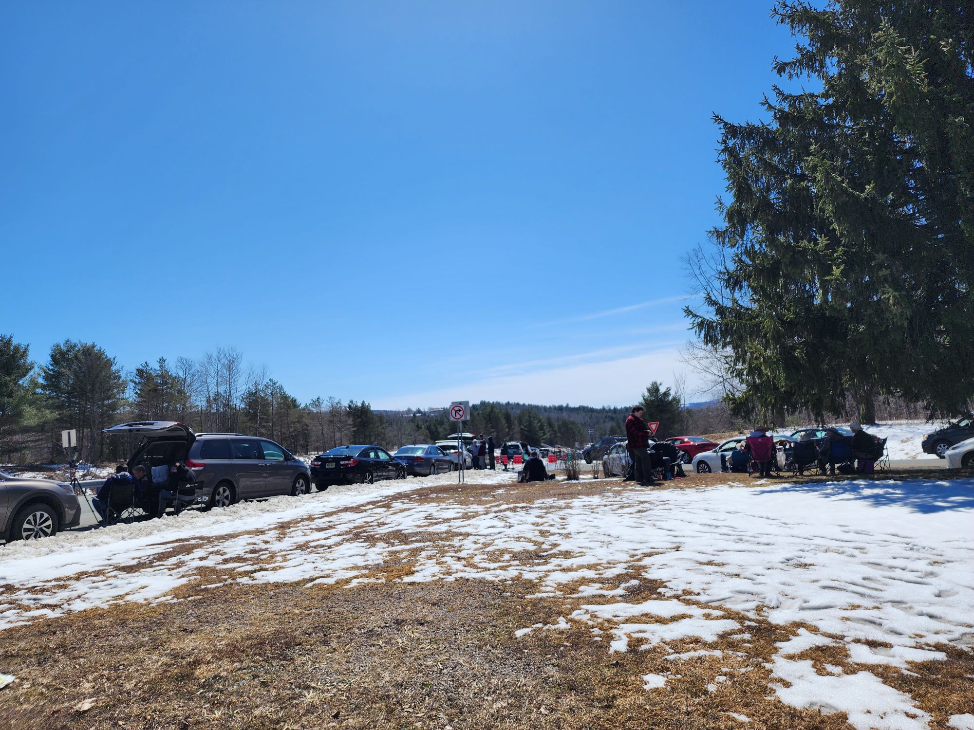 At a rest stop outside of Newport, Vermont. Cars surround the little patch of rest area. The sky is blue with not a cloud in sight, and the sun beats down with such warmth that you don’t mind the lingering patches of snow on the ground or the cool breeze that smells like pine trees. Some people are there with telescopes, too, and there are a few dogs. Others spread blankets out on the grass and people sit around in chairs under trees or near their cars. A dad and a son play Frisbee while waiting. An older woman walks by. “What a day to be alive!” she says.