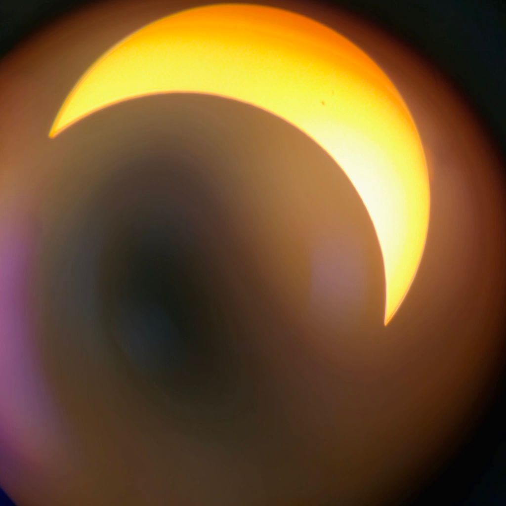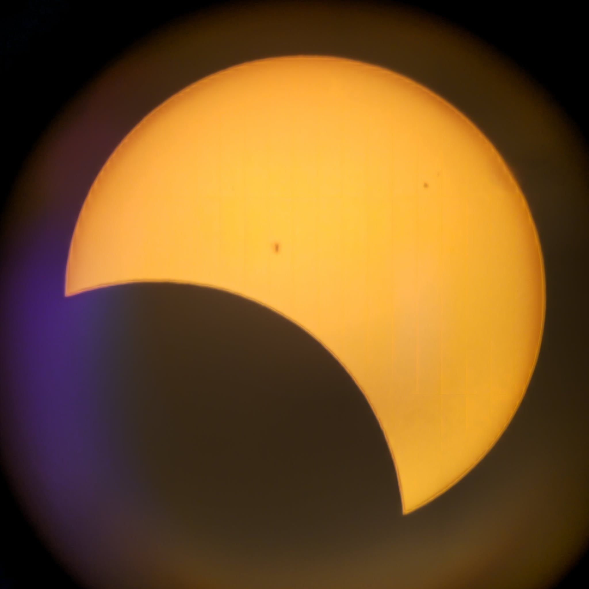 Across the way, someone is cooking bacon. There are a few scientists nearby, throwing words around like ‘progression’ and someone asks, “is this your first totality?” Several people are wearing black ‘2024 Solar Eclipse’ t-shirts. On the highway, cars trickle by, as well as some large trucks; the sound of plastic flapping loudly on wrapped cargo as it barrels down the hill. Some trucks honk at the people at the rest stop. In solidarity of the eclipse, perhaps, or maybe they’re annoyed there’s no room for them to stop…too rest…